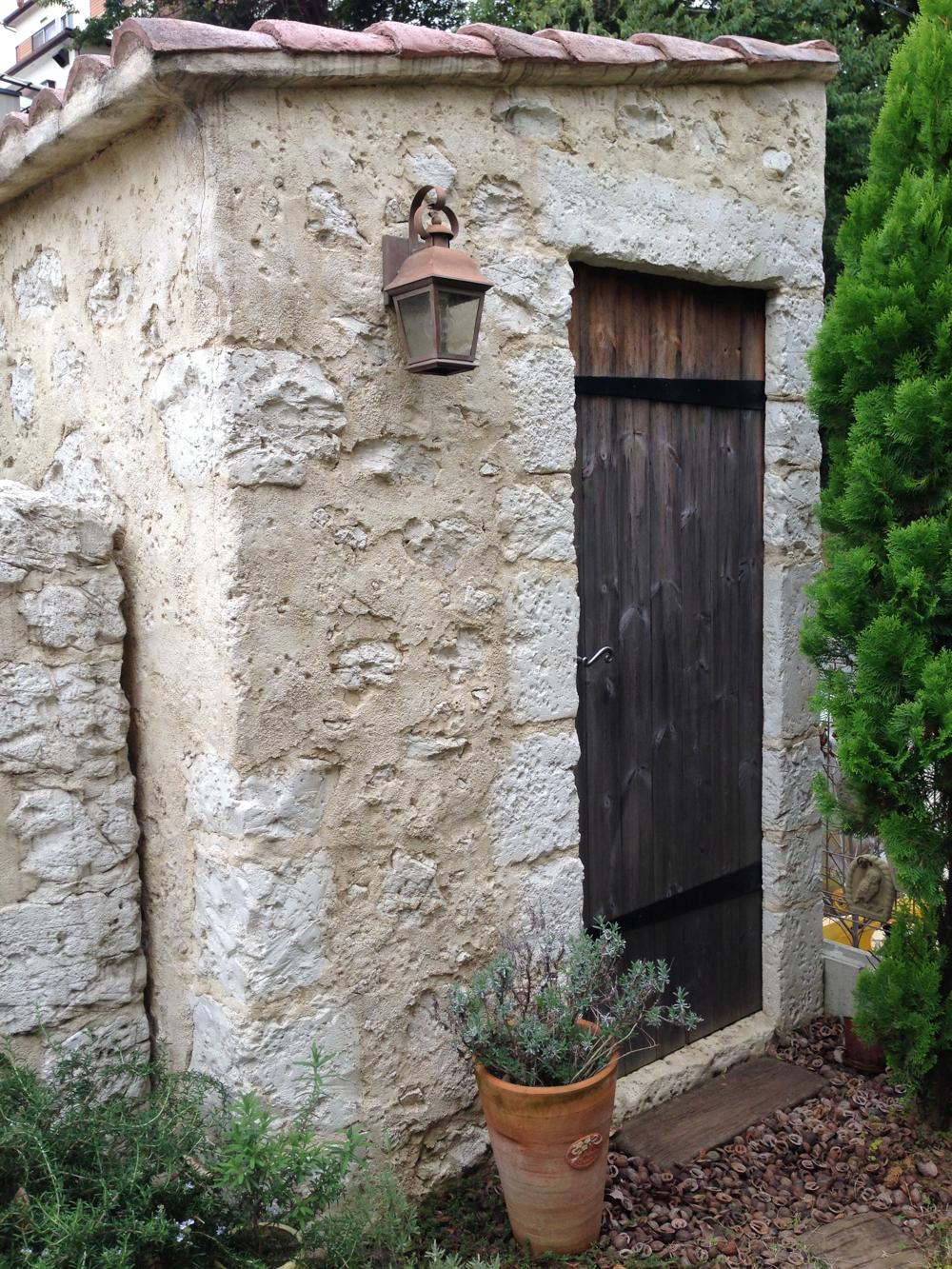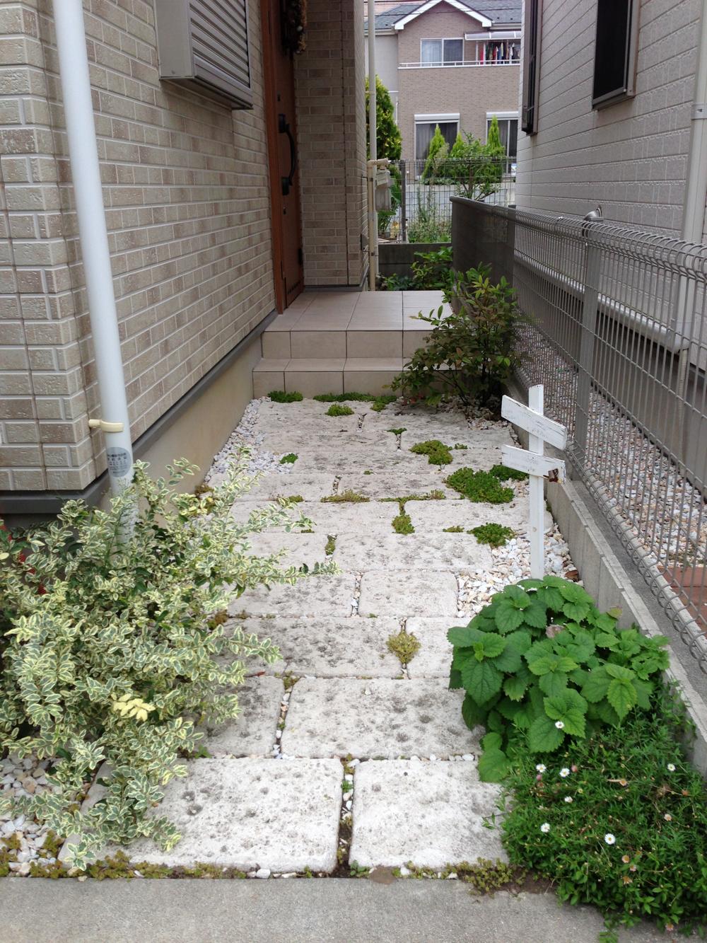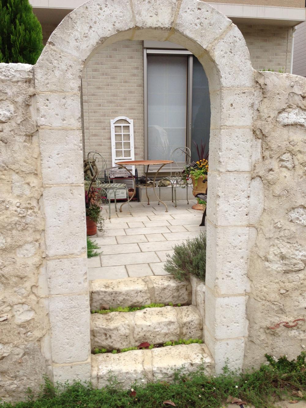 玄関へ続くアーチ、ベンチのある庭。倉庫代わりの小屋をまとまりのあるように施工しました。