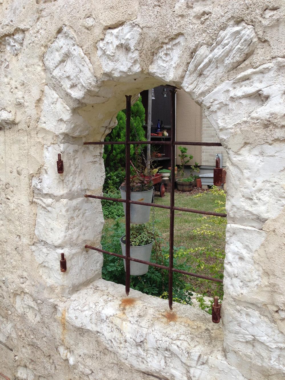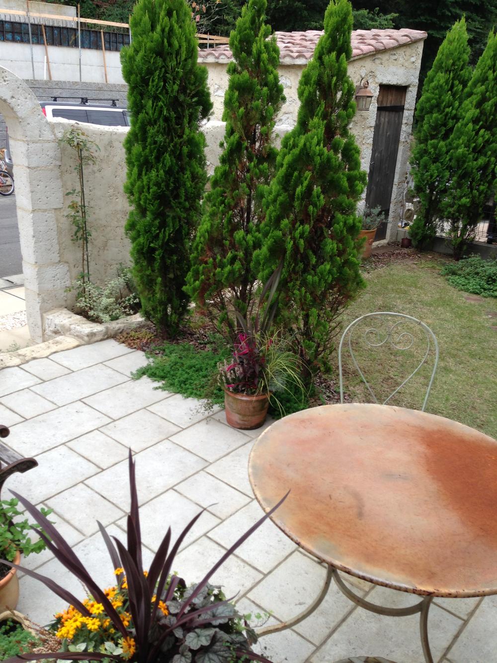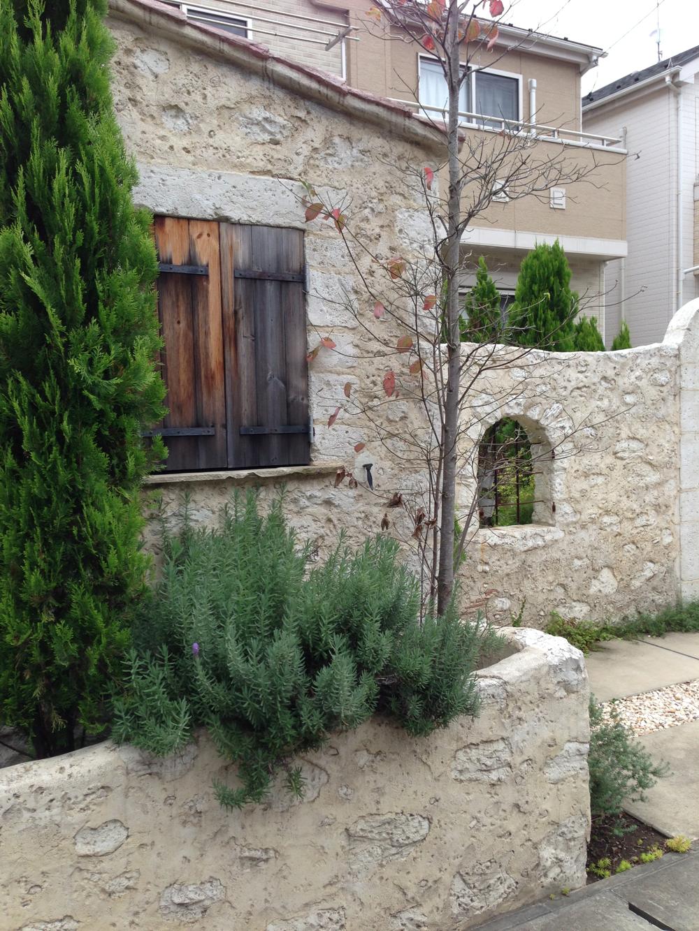 玄関へ続くアーチ、ベンチのある庭。倉庫代わりの小屋をまとまりのあるように施工しました。